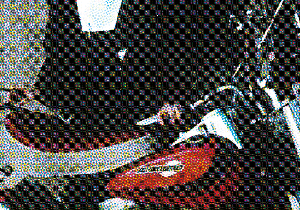 Sister Cortia Kent mit Motorrad, in Ellipsen gerastert und in CMYK gedruckt.