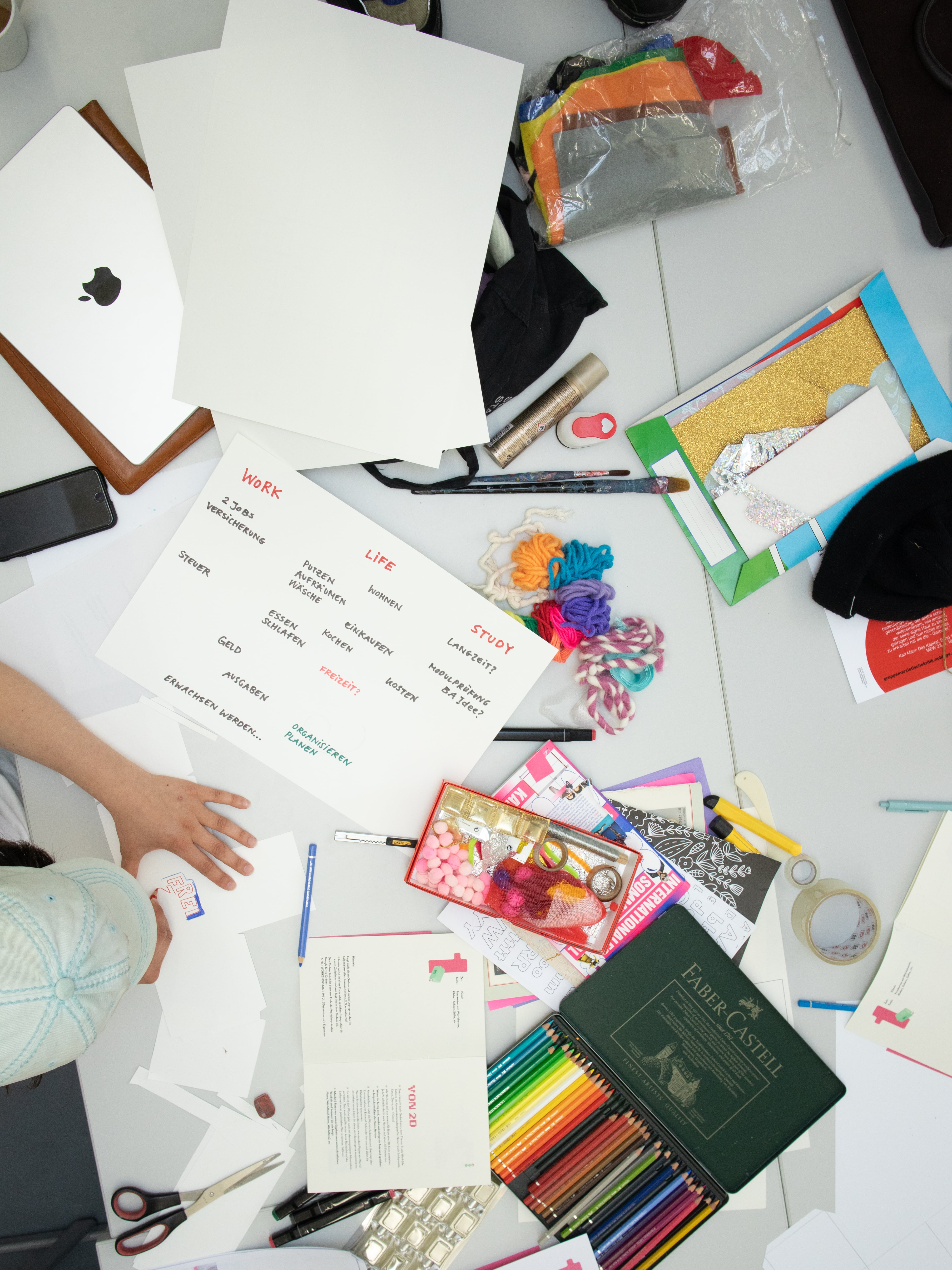 Wie wichtig ist für Euch als Designer*innen das Thema „study-work-life balance“? Notiert Eure Gedanken als Stichpunkte, Sätze oder Zeichnungen auf dem bereitliegenden A4-Blatt.